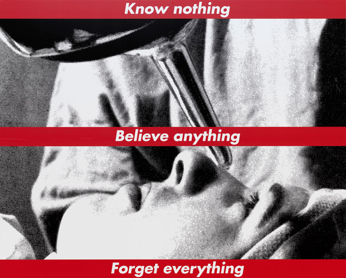 Untitled (Know nothing, Believe anything, Forget everything), 1987/2014, digital print on vinyl, 108 × 134 ¹¹⁄₁₆ in. (274.32 × 342.05 cm), National Gallery of Art, Washington, Gift of the Collectors Committee, Sharon and John D. Rockefeller IV, Howard and Roberta Ahmanson, Denise and Andrew Saul, Lenore S. and Bernard A. Greenberg Fund, Agnes Gund, and Michelle Smith.