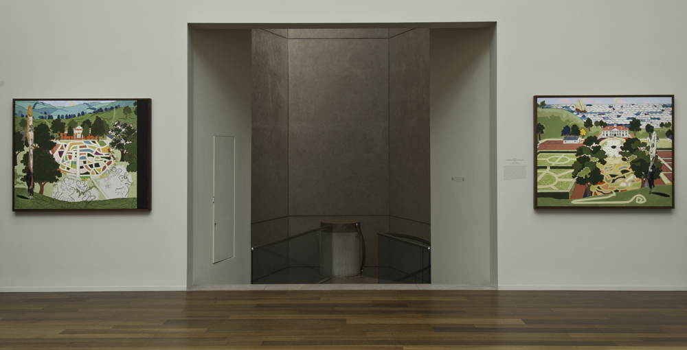 Installation view of In the Tower: Kerry James Marshall. Left: Study for "Visible Means of Support: Monticello," 2008, acrylic on PVC panel, Rodney M. Miller Collection, courtesy of Jack Shainman Gallery, New York. Right: Study for "Visible Means of Support: Mount Vernon,” 2008, acrylic on PVC panel, Pat and Bill Wilson, San Francisco. Photo by Rob Shelley © 2013 National Gallery of Art, Washington