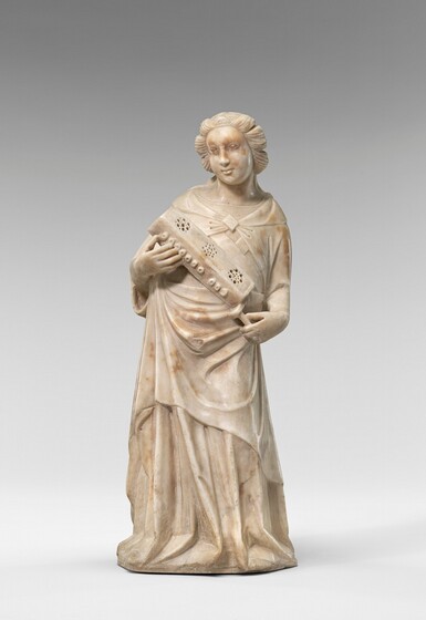 The Virgin Annunciate (shown here) and The Archangel Gabriel make up a monumental Annunciation pair, in which Mary holds the Old Testament from which she has been reading the prophecies that a virgin would conceive. Arriving to announce to her that she has been chosen for this honor, the Archangel Gabriel places one hand over his heart to acknowledge her sanctity and greets her with the other hand. In exquisite Gothic refinement, Mary and the angel, with small, fine features and rhythmically waving hair, incline toward each other in graceful poses. The deep, curving folds of drapery create elegantly ornamental surface effects and add grace to their subtle movements.