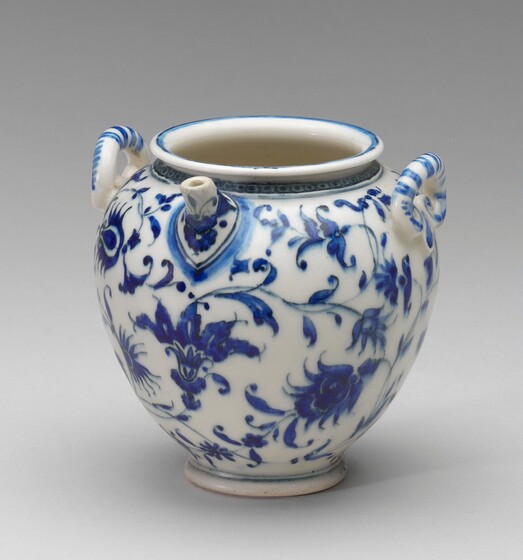 In 1487, the sultan of Mamluk Egypt sent a gift to Lorenzo de’ Medici of exotic animals and “large vessels of porcelain, the like of which has never been seen.” By the mid 1500s, the Medici family’s porcelains, most from China, numbered in the hundreds. Italian potters were able to create a soft-paste imitation of porcelain, and in 1574 Francesco de’ Medici established two ceramic workshops in Florence to produce these wares. Today, some seventy examples of Medici porcelains are known, including this flask, possibly used for oil.