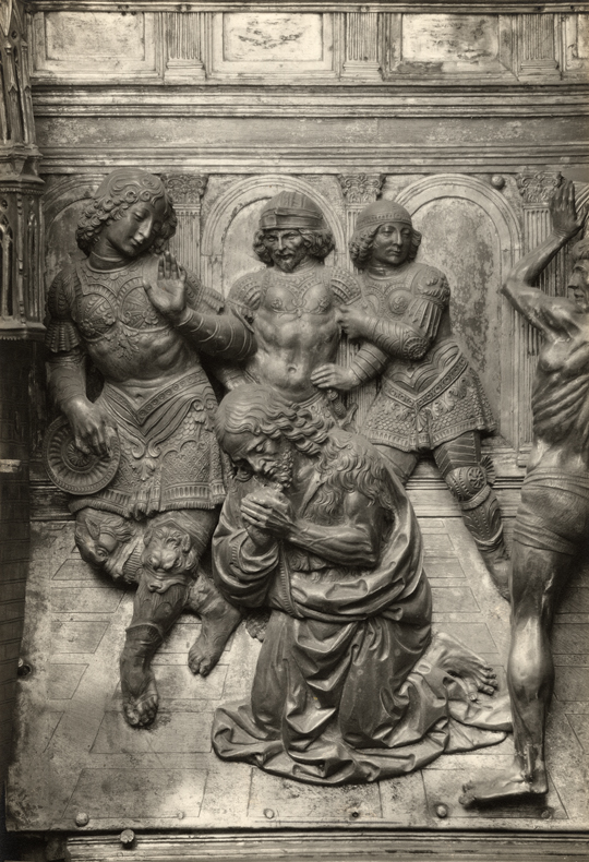 Clarence Kennedy, Soldiers and St. John, Florence, 1932, gelatin silver print, detail of The Beheading of Saint John the Baptist by Andrea del Verrocchio, Museo dell’Opera del Duomo, Florence