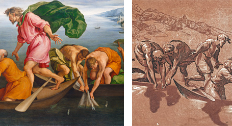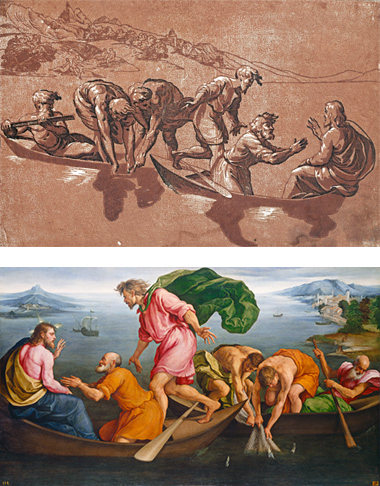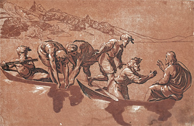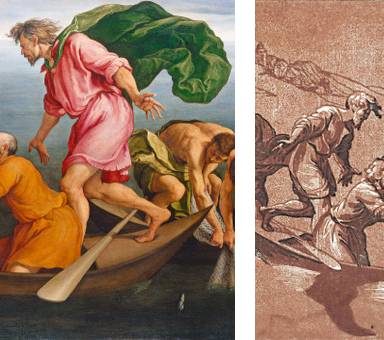 For The Miraculous Draught of Fishes, Jacopo copied many elements directly from Ugo da Carpi: the figure groupings, their positions, actions, garments, and even the oar projecting from beneath Andrew's legs are taken nearly exactly from the original, though in reverse.