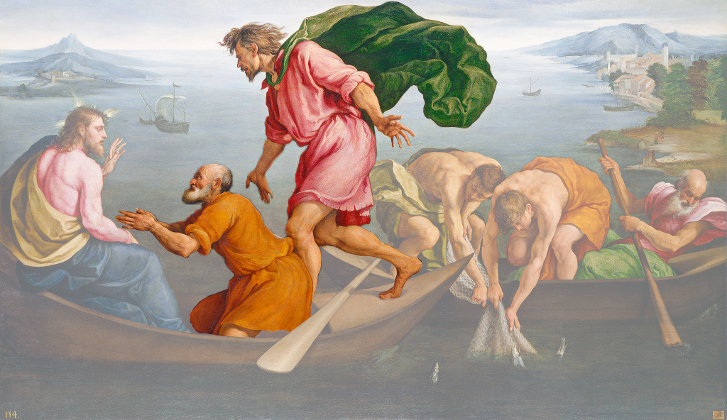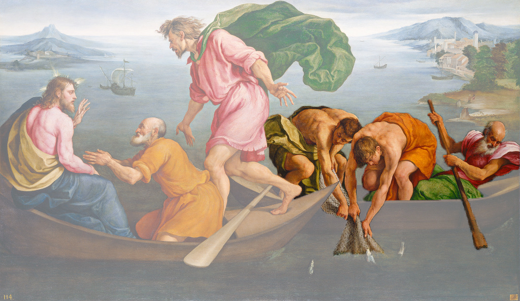 The painting depicts a story from the New Testament in which Jesus calls Peter to become a disciple. The story (Luke 5:1-11) of the miraculous draught (haul) of fishes begins on the shores of Lake Gennesaret, where throngs of followers pleaded with Christ to speak to them. He stepped into a boat and asked to be rowed out into the water. There he preached to the crowds. The boat belonged to two fishermen, Peter and his brother Andrew.
