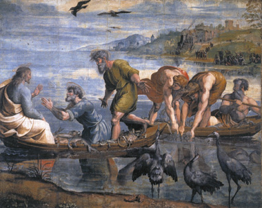 Thirty years earlier the celebrated artist Raphael had been commissioned to make a tapestry design (or cartoon) depicting The Miraculous Draught of Fishes. As the subject for his work, he chose the moment when Peter confesses his sinfulness to Christ. Raphael adopted the motifs of two boats overlapping and Peter kneeling before Christ from earlier images.