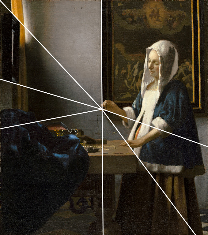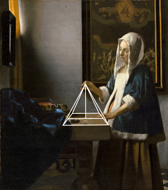 The balance point of the scales is exactly at the center of the painting. The woman's hands, the jewelry, and the tabletop form the shape of a pyramid. This imaginary pyramid supports the woman's hand and encloses the balance.