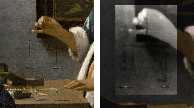 Infrared reflectography reveals that Vermeer changed the position and increased the size of the balance.