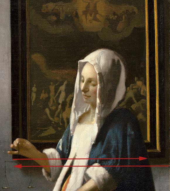 Vermeer frequently modified the scale and even the shape of objects to achieve a desired effect. Note, for example, that the bottom edge of the frame around the Last Judgment scene is higher in front of the woman than behind her, to allow sufficient space for the balance.