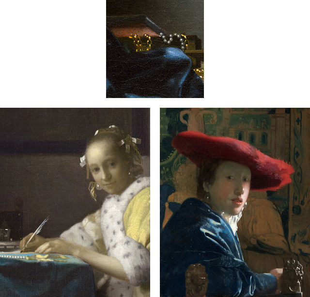 In the 1660s Vermeer painted pearls in two layers: first a thin, diffused grayish glaze, followed by a thick stroke on top to create a specular highlight. Vermeer used a similar layering technique to paint the pearl earrings in A Lady Writing. He may have experimented with a camera obscura* to achieve these optical effects.