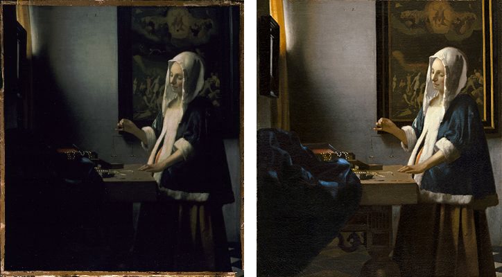 (left) Woman Holding a Balance (before restoration), c. 1664, oil on canvas, Widener Collection, 1942.9.97