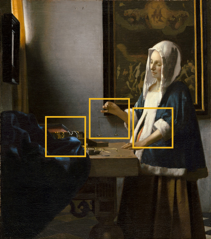 Woman Holding a Balance (details), c. 1664, oil on canvas, Widener Collection, 1942.9.97