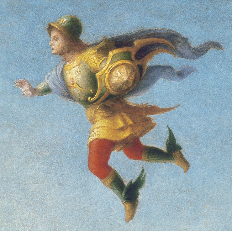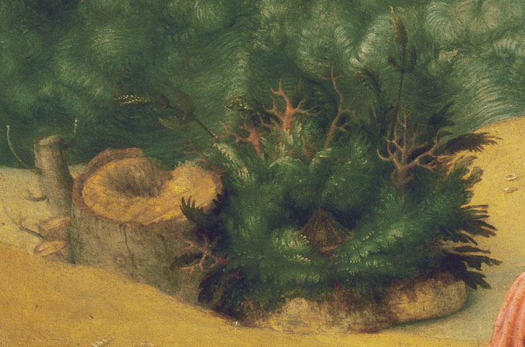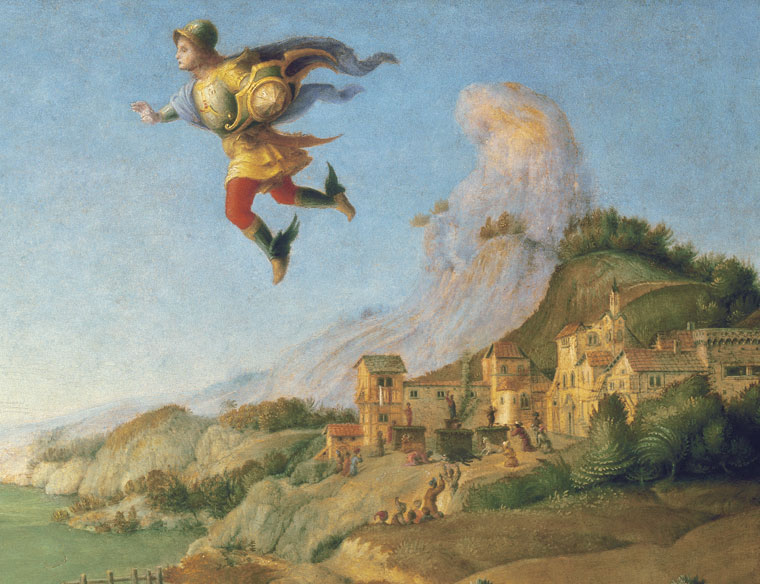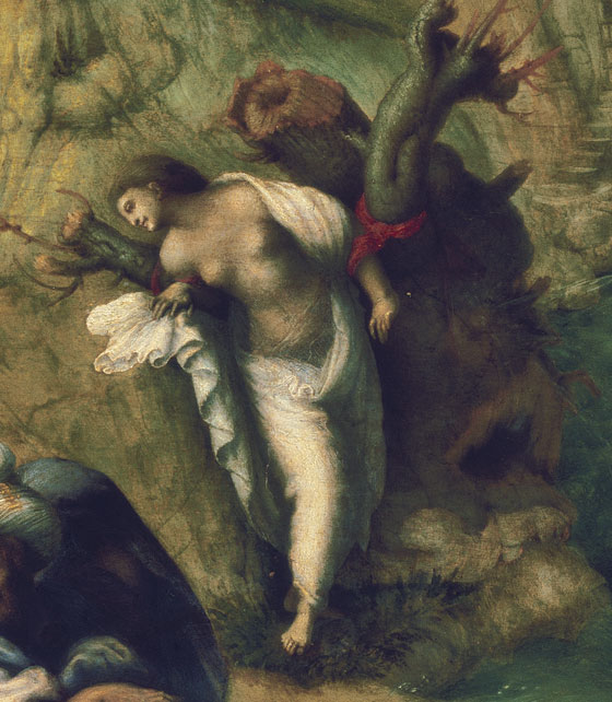 The branches of coral at the seaside reveal Piero’s clear understanding of Ovid’s Metamorphoses. After killing the sea monster, Perseus descended to earth and laid down the head of Medusa—another hideous monster he had slain. Medusa’s head carried the power to petrify anything it touched. When the warrior gently covered the bloody head with seaweed and twigs, they hardened into branches of red coral.