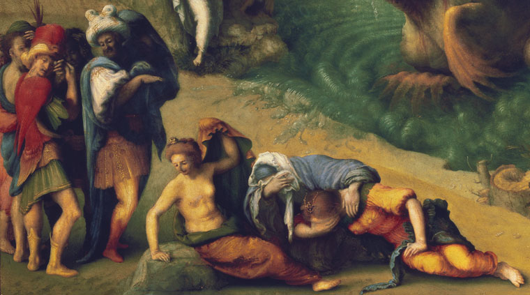 Andromeda’s anguished father, King Cepheus, identifiable by his lavish white turban, stands on shore. Her mother, Queen Cassiopeia, lies prostrate on the ground, hand shielding her eyes from the princess’s possible demise. At far left, Andromeda’s uncle and suitor Phineus, his costume adorned with extraordinary red-feathered wings, also looks away.