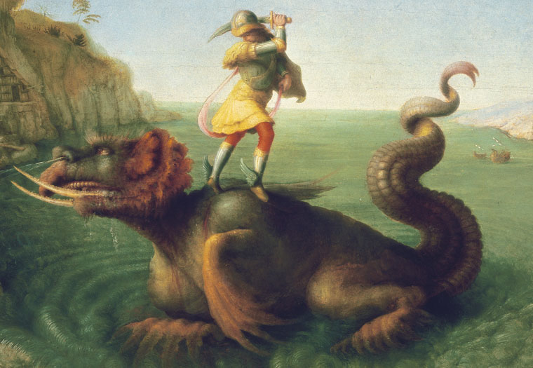 As Ovid writes, “Perseus came plunging in his steep dive down air and attacked the monster, who roared as his shoulder took the sword-blade up to the hilt.” The beast roils the sea’s surface in his death throes; his coiling tail, webbed feet, and long fangs are both monstrous and comically elegant, and seawater jets from his nostrils. Piero’s biographer Vasari wrote, “it is not possible to find a more bizarre or fantastic sea-monster than that which Piero imagined and painted.”