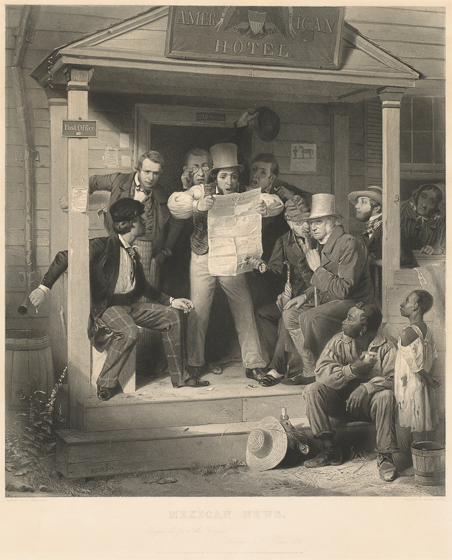 The “Mexican News” referenced here was that the US–Mexican War was coming to an end in 1848, after two years of fighting. Richard Caton Woodville completed the original painting in 1848, and artist Alfred Jones engraved a copy for distribution to members of the American Art-Union.