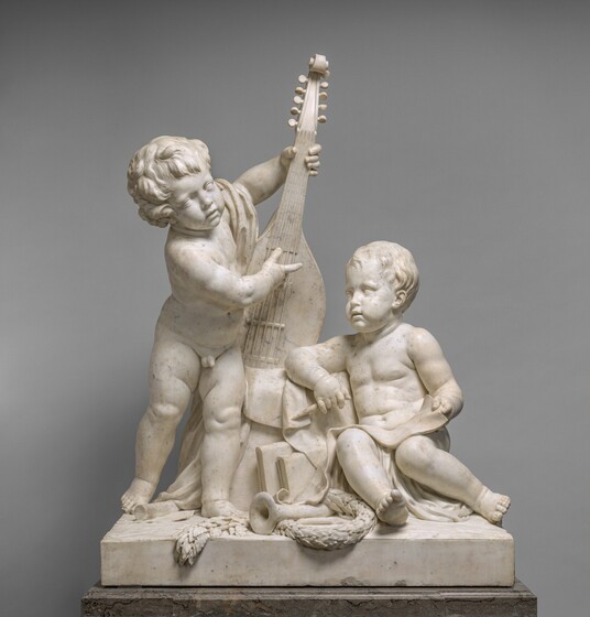With Clodion's Poetry and Music, this allegory was one of four that were meant to bring to life the abstract concepts of the arts and sciences. They were commissioned by Louis XV's finance minister Abbé Terray for his elaborate Paris residence. The subject was an appropriate one for Terray, since he also served briefly as the director of the king's buildings with overall responsibility for the state of the arts in France. Painting, sculpture, music, and literature are celebrated by the young cupidlike figures in the two works here; other children carved by two other artists represented geometry, geography, architecture, and astronomy.
