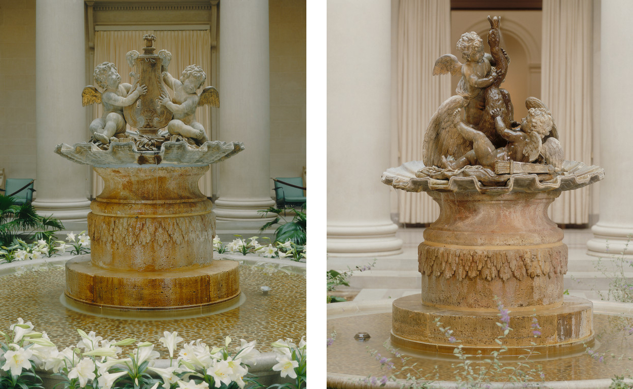 The two sculptures decorating the East and West Garden Courts at the National Gallery of Art were originally created as garden fountains for Versailles. Pierre Legros' Cherubs Playing with a Lyre (in the east court) and Jean-Baptiste Tuby's Cherubs Playing with a Swan (in the west court) were executed in lead and completely gilded (traces of the gold are still visible), following designs sketched by Le Brun. They were installed in Louis XIV's théâtre d'eau ("water theater"), a spectacle of fountains and cascades laid out to suggest an aquatic amphitheater. The project was so costly to maintain, diverting nearly all the water from nearby villages, that it was disassembled by Louis XV. In the National Gallery's installation, the flow of the water, which originally shot up many feet, has been redirected and reduced.