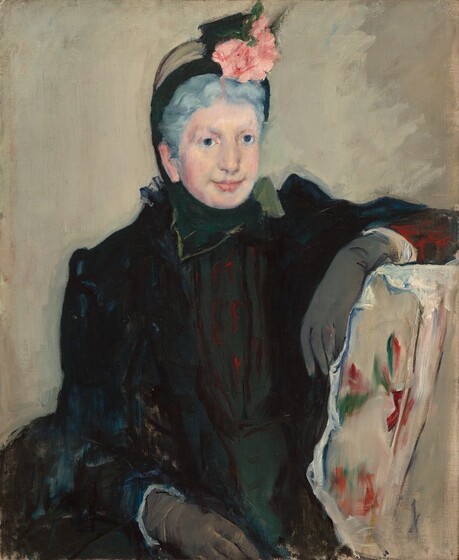 Although the identity of the sitter in Portrait of an Elderly Lady is unknown, she appears in other works by the artist. Cassatt paints the woman with characteristic candor, including gray hair and wrinkles. Sitting on a chintz upholstered slipper chair with her elbow slung across the top, her casual pose exudes self-confidence. The large, pink rose in her bonnet is a youthful symbol that brightens her dark attire.