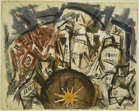 John Marin, Lower Manhattan (Composition Derived from Top of Woolworth Building), 1922, watercolor and charcoal with paper cut-out attached with thread on paper, 21 5/8 x 26 7/8" (54.9 x 68.3 cm), The Museum of Modern Art, New York. Acquired through the Lillie P. Bliss Bequest, Photograph © 2001 The Museum of Modern Art, New York (exhibited at An American Place, 1932)