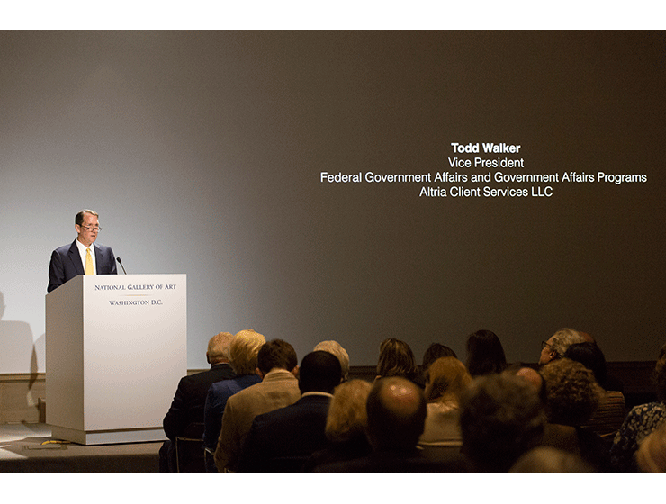 Mr. Todd Walker, vice president, federal government affairs and government affairs programs, Altria Client Services LLC, presenting remarks. Three Centuries of American Prints from the National Gallery of Art is made possible by Altria Group in celebration of the 75th Anniversary of the National Gallery of Art, and is Altria’s twelfth exhibition sponsorship at the Gallery.