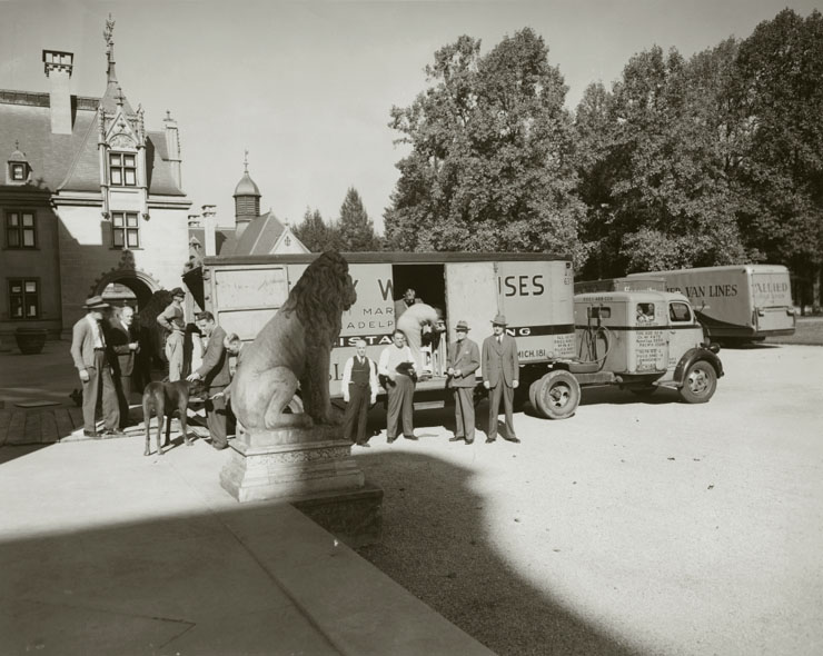 Trucks carrying works of art preparing to leave the Biltmore House for the National Gallery of Art, October 1944. National Gallery of Art, Gallery Archives.