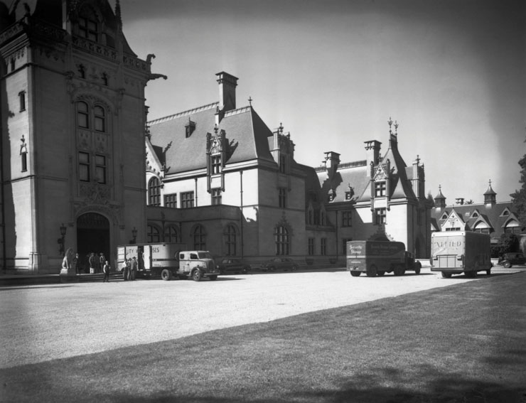 Trucks at the Biltmore House preparing to return works of art to the National Gallery of Art after wartime storage, October 1944. National Gallery of Art, Gallery Archives.