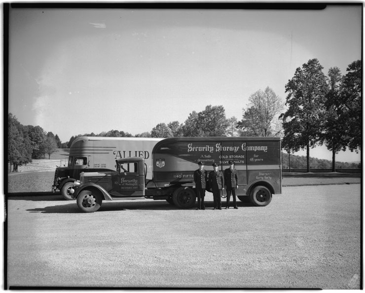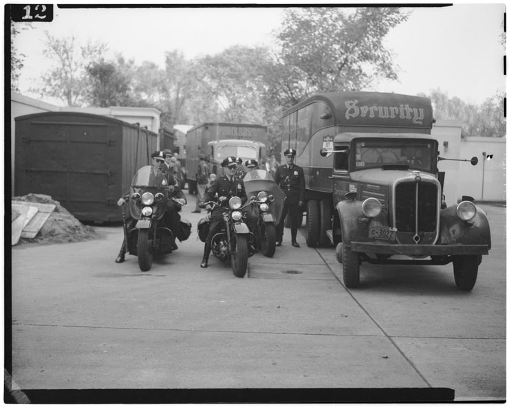 Security escorting trucks returning works of art to the National Gallery of Art, October 1944. National Gallery of Art, Gallery Archives.