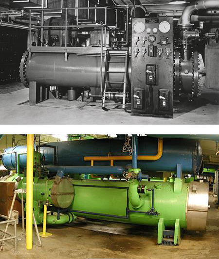 (top) One of the original West Building refrigerating compressors, 1941