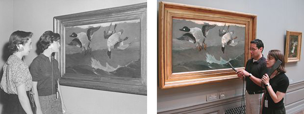 (right) Using hand-held digital audio players, visitors listen to commentary about Right and Left by Winslow Homer, 2001