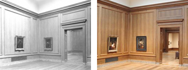 Exhibition rooms in the West Building were designed to be harmonious settings for works of art. To accomplish this, the architectural details in each gallery reflect the place and period that produced the art displayed in it, so that the room itself becomes a second frame for the paintings. Galleries 48 and 51 were finished with wood paneling to evoke the homes and style of the Dutch seventeenth century. When the museum opened in 1941, A Polish Nobleman and other works by Rembrandt and his circle from the Mellon Collection hung there. In 2001, A Polish Nobleman, now reframed, hangs in the same location. One of the new Dutch Cabinet Galleries, completed in 1995, can be seen through Gallery 48.