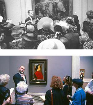 (bottom) Museum lecturer Philip Leonard interpreting Botticelli's Giuliano de' Medici for Gallery visitors, 1992; photograph © Dennis Brack/Black Star
