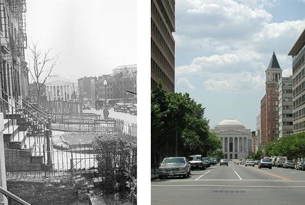 Sixth Street, a north-south thoroughfare, was closed in 1937 at Constitution Avenue for construction of the original West Building of the National Gallery of Art. Since then, large office buildings gradually have replaced small-scale brick row houses on Sixth Street as the urban core of the city has evolved. The grand north facade of the West Building remains as a dramatic terminus for this urban vista.