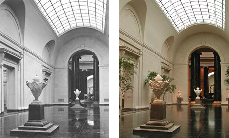 Dramatic sculpture halls extending to the east and west of the central Rotunda establish the monumental core of John Russell Pope's design for the West Building. In 1940 two large marble urns by Clodion were acquired to articulate the dramatic space of the East Sculpture Hall. Sixty years later, the urns, part of the Andrew Mellon Collection, remain in the same location, joined by other sculptures and decorative plants.