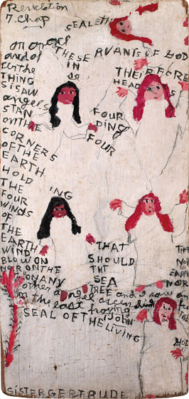 Sister Gertrude Morgan (American, 1900–1980), Revelation 7. chap, c. 1970, paint on wood, Courtesy of The Museum of Everything, London