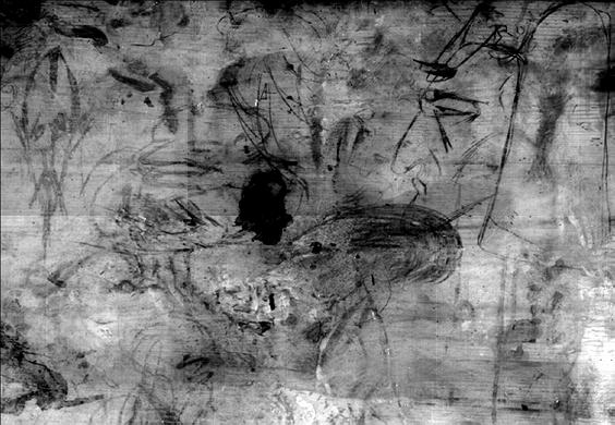 (top right) Detail from composite infrared reflectogram of The Tragedy (1.5-2.0 microns), showing sketches from 1899 drawn directly on the surface of the panel