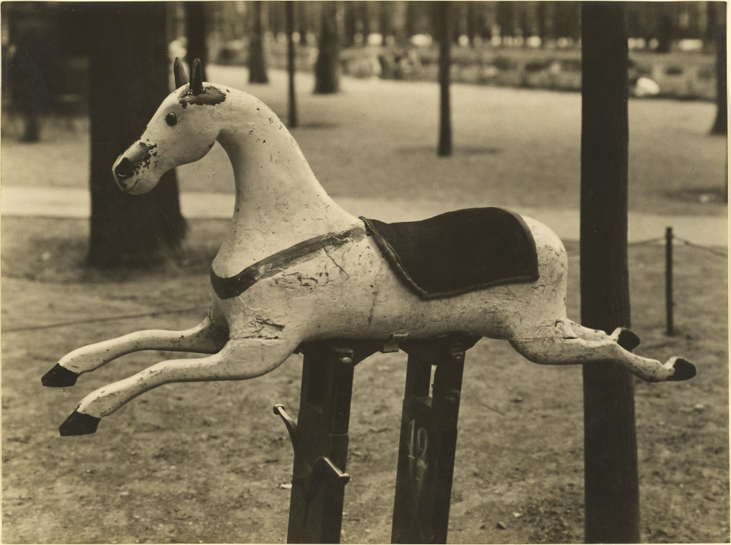 Born in Hungary, André Kertész moved to Paris in 1925 and immediately began to explore the city with his camera. In this photograph, a wooden carousel horse in an otherwise deserted Luxembourg gardens seems to oscillate between objecthood and animation, and points to the photographer’s playful sense of humor.