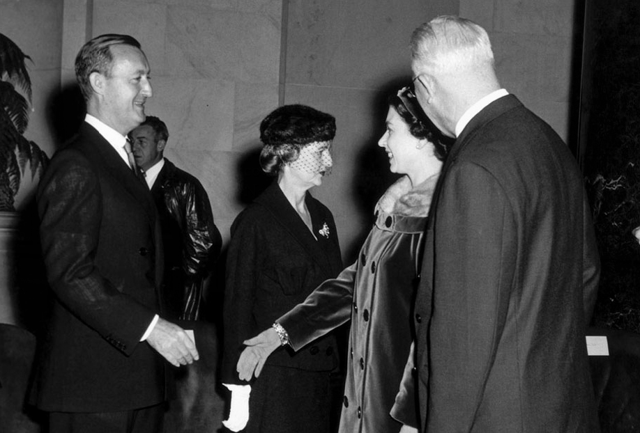 Paul Mellon and Mrs. Rush Kress greet Queen Elizabeth II of Great Britain in the Rotunda of the National Gallery, October 18, 1957.