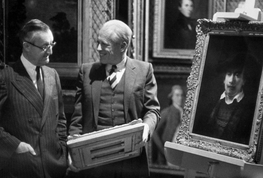 Paul Mellon and National Gallery director John Walker examine paintings to be installed in a 1967 exhibition.
