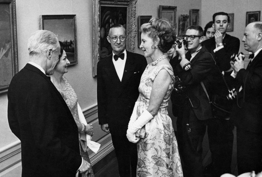 Paul and Bunny Mellon with Lady Bird Johnson, wife of President Lyndon B. Johnson, and Gallery director John Walker on the opening night of the twenty-fifth anniversary exhibition, "French Paintings from the Collections of Mr. and Mrs. Paul Mellon and Mrs. Mellon Bruce," March 17, 1966