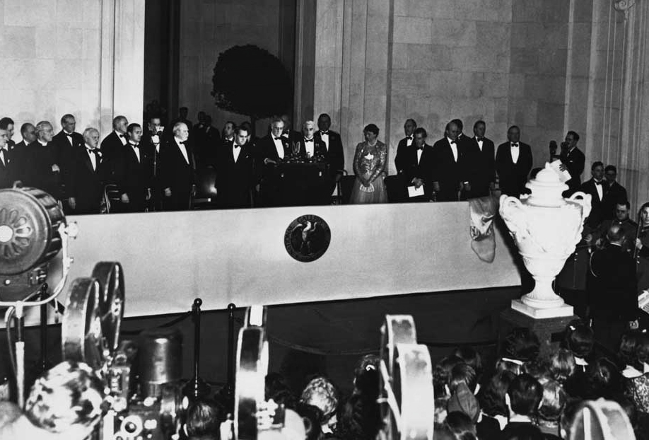 President Roosevelt at the podium during the dedication of the National Gallery of Art, March 17, 1941. Paul Mellon stands in the front row to the President's right, next to Chief Justice Charles Evans Hughes.