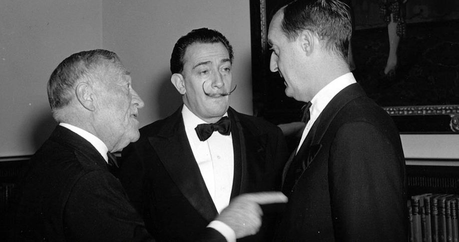 Founding benefactor Chester Dale in conversation with Paul Mellon and artist Salvador Dalí during the National Gallery's fifteenth anniversary celebration, March 17, 1956.