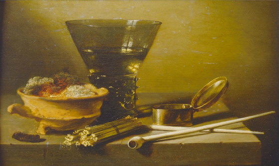 Still Life with Smoking Implements and Berkemeyer, 1638, oil on panel, 28.2 x 45.7 cm (11 1/8 x 18 in.), Private collection