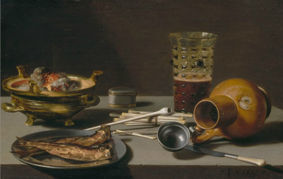 Still Life with Smoking Implements, Herring, and Overturned Jug, 1627, oil on panel, 36.2 x 57.5 cm (14 1/4 x 22 5/8 in.), Timken Museum of Art, San Diego, The Putnam Foundation
