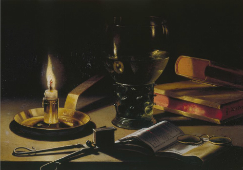 Still Life with Books and Burning Candle, 1627, oil on panel, 26.1 x 37.3 cm (10 1/4 x 14 11/16 in.), Royal Picture Gallery, Mauritshuis, The Hague