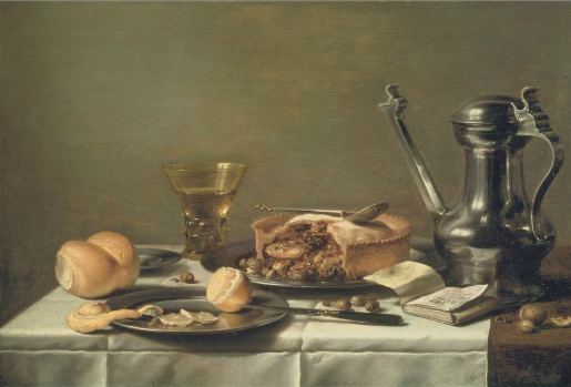 Still Life with Pewter Pitcher, Mince Pie, and Almanac, c.1630, oil on panel, 47.6 x 70.2 cm (18 3/4 x 27 5/8 in.), Private collection