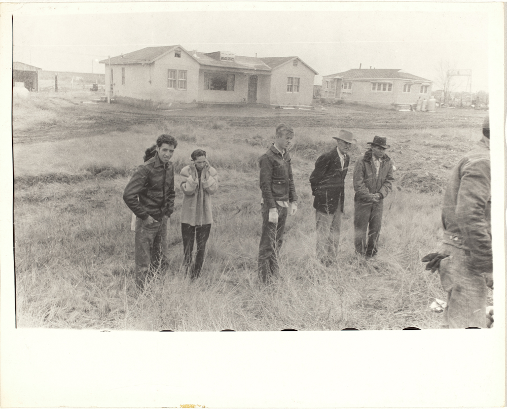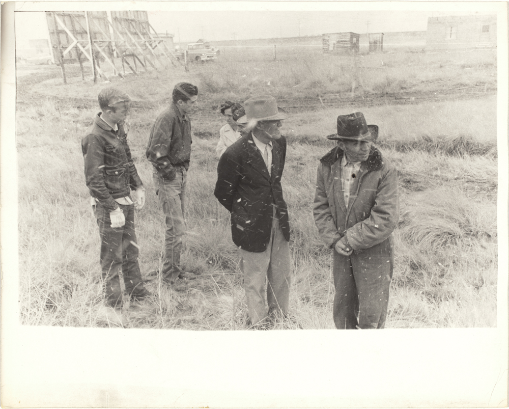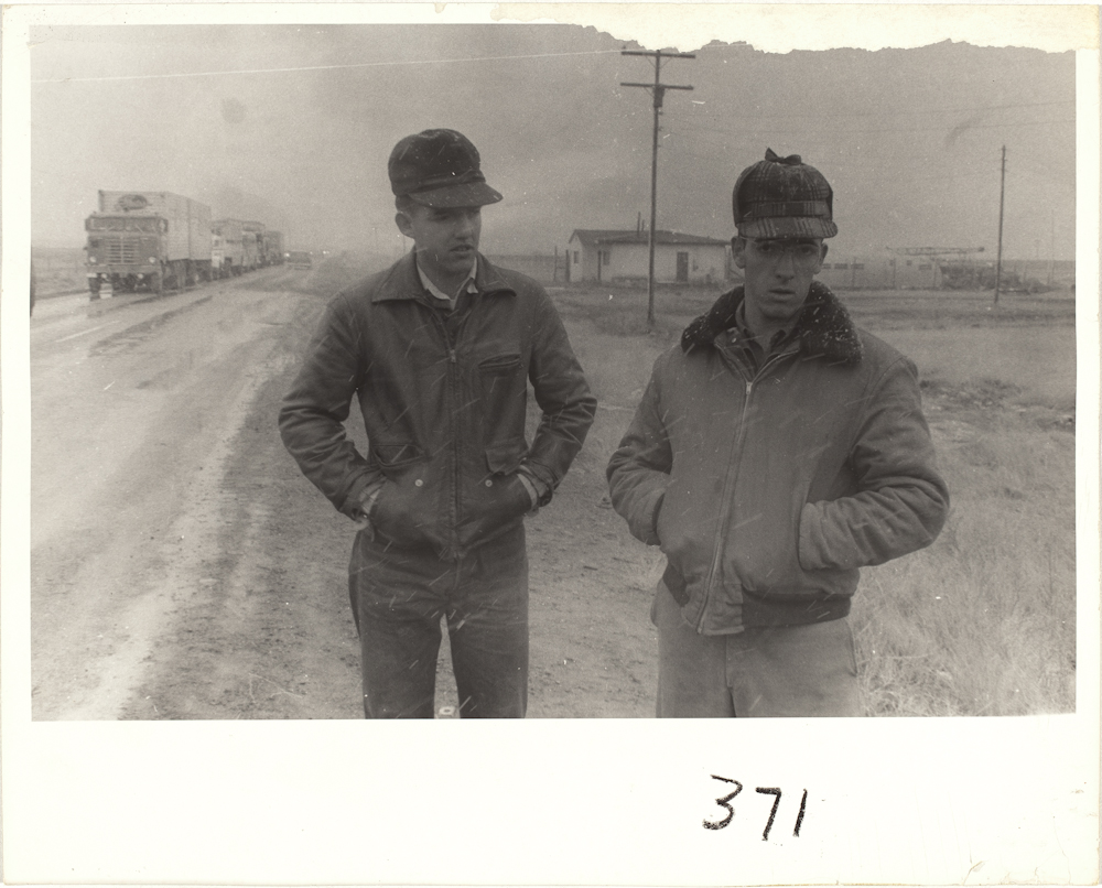 Two men standing by side of road in snow—U.S. 66 between Winslow and Flagstaff, Arizona, 1955, 1990.28.467