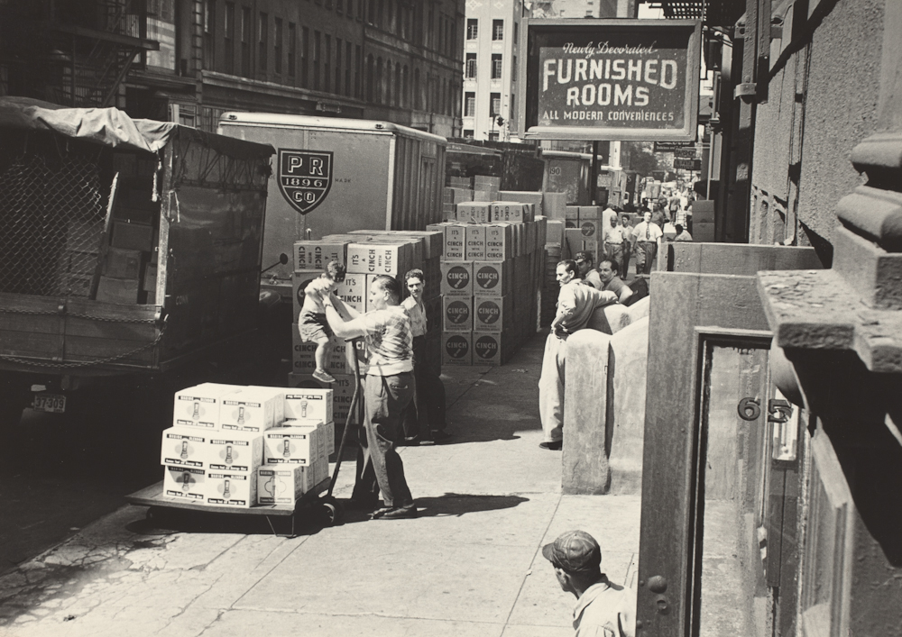 By 10 o'clock Georgie has been sent out of the rooming house to his playground--the sidewalk. His friends, truckmen and loaders, keep an eye on him during the day, 1951, 1990.28.10