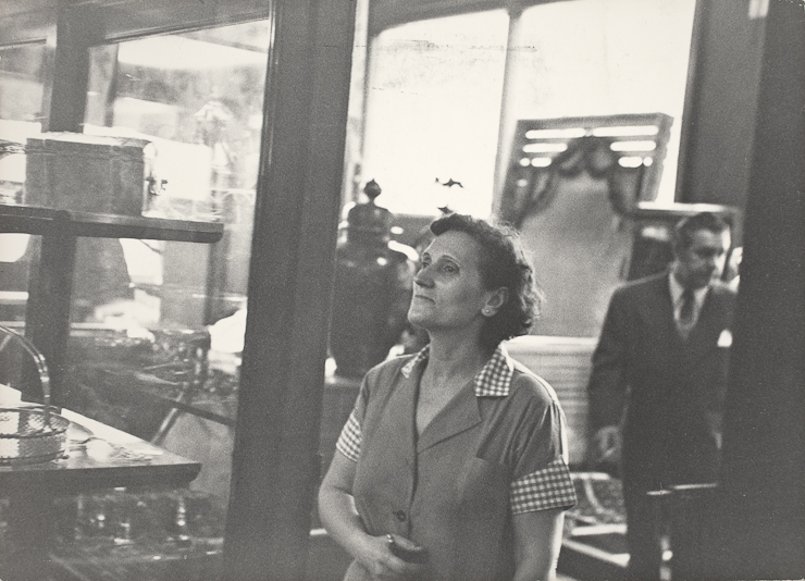 At some time during the afternoon Lena might be seen looking at the silverware at Lawner's Auctioneers, next to Benny's, 1951, 1990.28.16