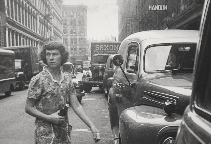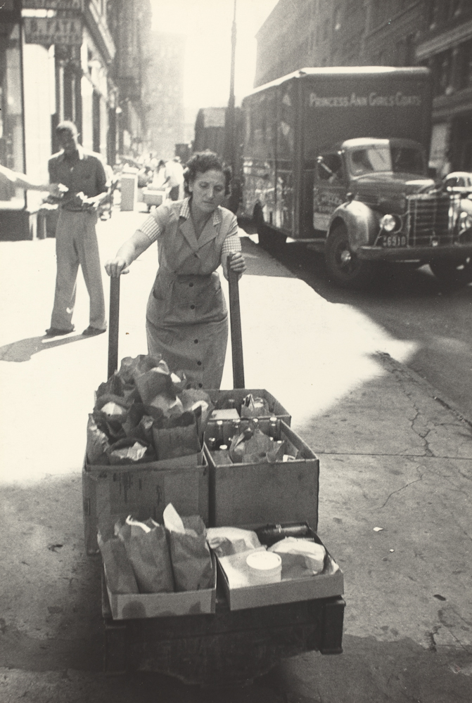 Just before noon Lena Kansler delivers orders to the building at the west corner of the block. Her husband Benny runs the luncheonette, 1951, 1990.28.12