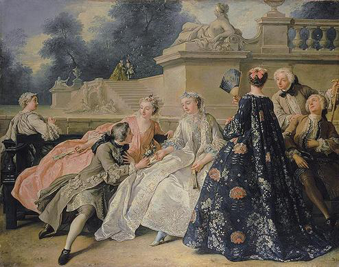 To contemporaries, Jean-François de Troy was best known as one of the greatest history painters of the first half of the century--indeed, he ended his official career as director of the French Academy in Rome. But he had also turned his hand to genre and in the 1720s and 1730s painted a series of brilliant scenes of dalliance and flirtation. One of his masterpieces is The Declaration of Love. It was acquired by the Prussian king Frederick II, a passionate collector of contemporary French painting, and hung in his country palace of Sanssouci, Potsdam, along with works by Watteau and Lancret. The Declaration of Love is derived from Watteau's fêtes galantes, showing as it does a group of seven young aristocrats dressed in the latest fashion, flirting in an elegant park. But the contemporary costumes depicted by De Troy with evident delight in their embroidery and brocade, their shimmer and sheen; the blatant gesture of the main protagonist as he presents a posy to the woman in a silver dress; and the exchanges of glance and gesture give the scene a more literal aspect than the ambiguous and melancholic poetry we encounter in the art of Watteau.