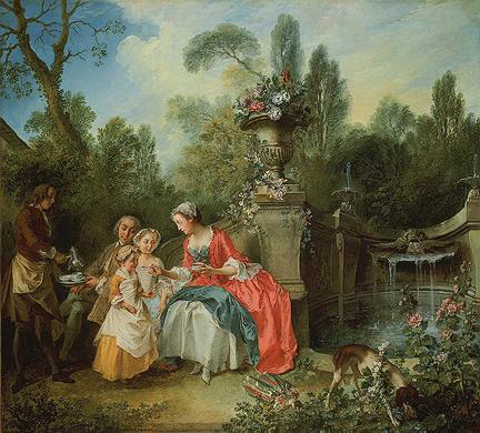 Watteau's elegant fêtes galantes, finely painted and often exploring the vagaries of love, set the tone for much eighteenth-century French painting. And for whom is love not an important subject? He had several followers in the early decades of the century, the greatest of whom was Nicolas Lancret. A Lady in a Garden Taking Coffee with Some Children adapts the typical parkland setting of Watteau's fêtes galantes to the theme of familial love. Carefully aproned in case of a spill, a little girl is offered her first taste of coffee by her solicitous young mother. Against the little one's trepidation about this adult drink, her older sister's patience shows the confidence of her years. This picture is almost certainly not a portrait group, but an imaginary genre scene depicting ideal family life in a perfect setting.
